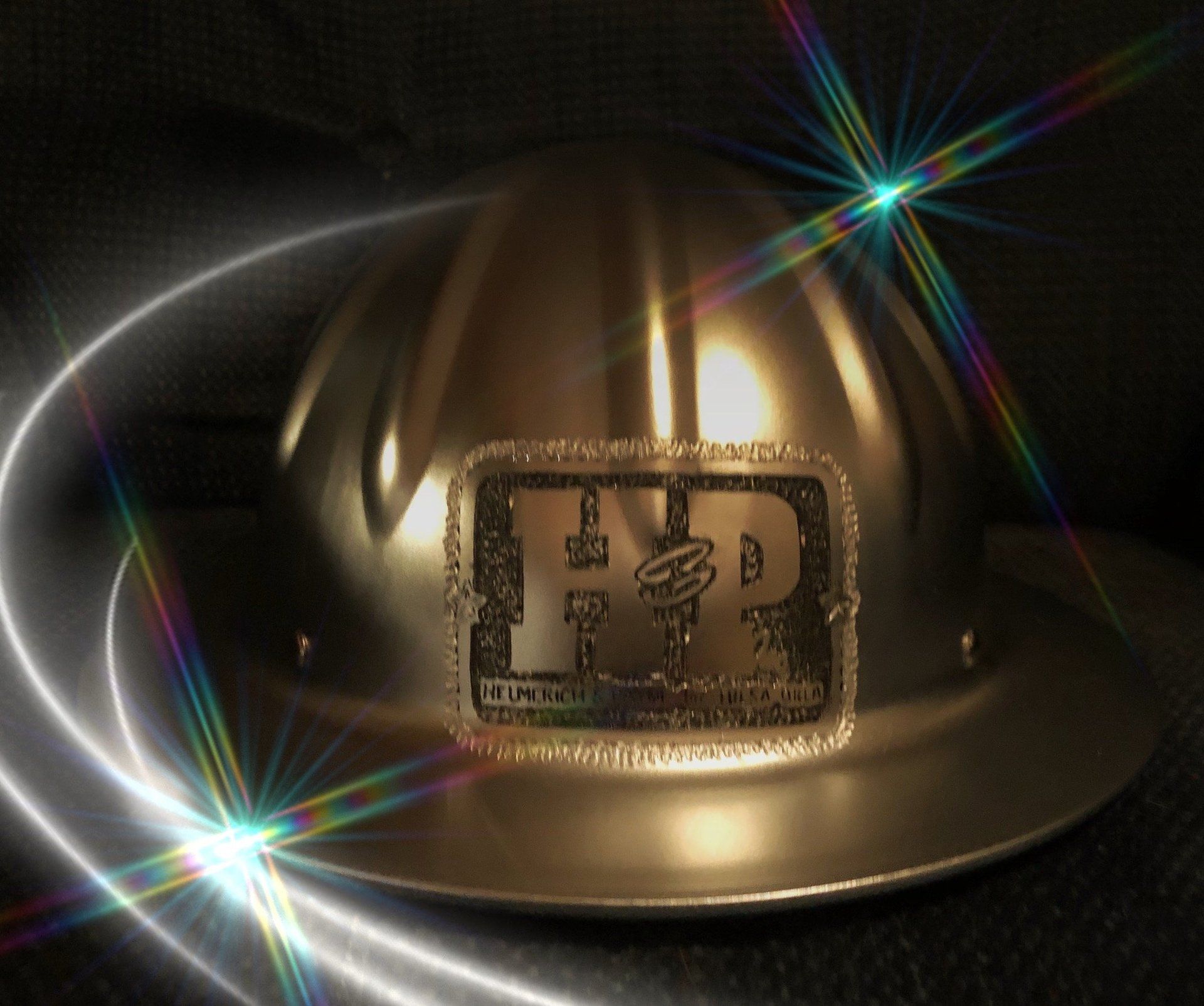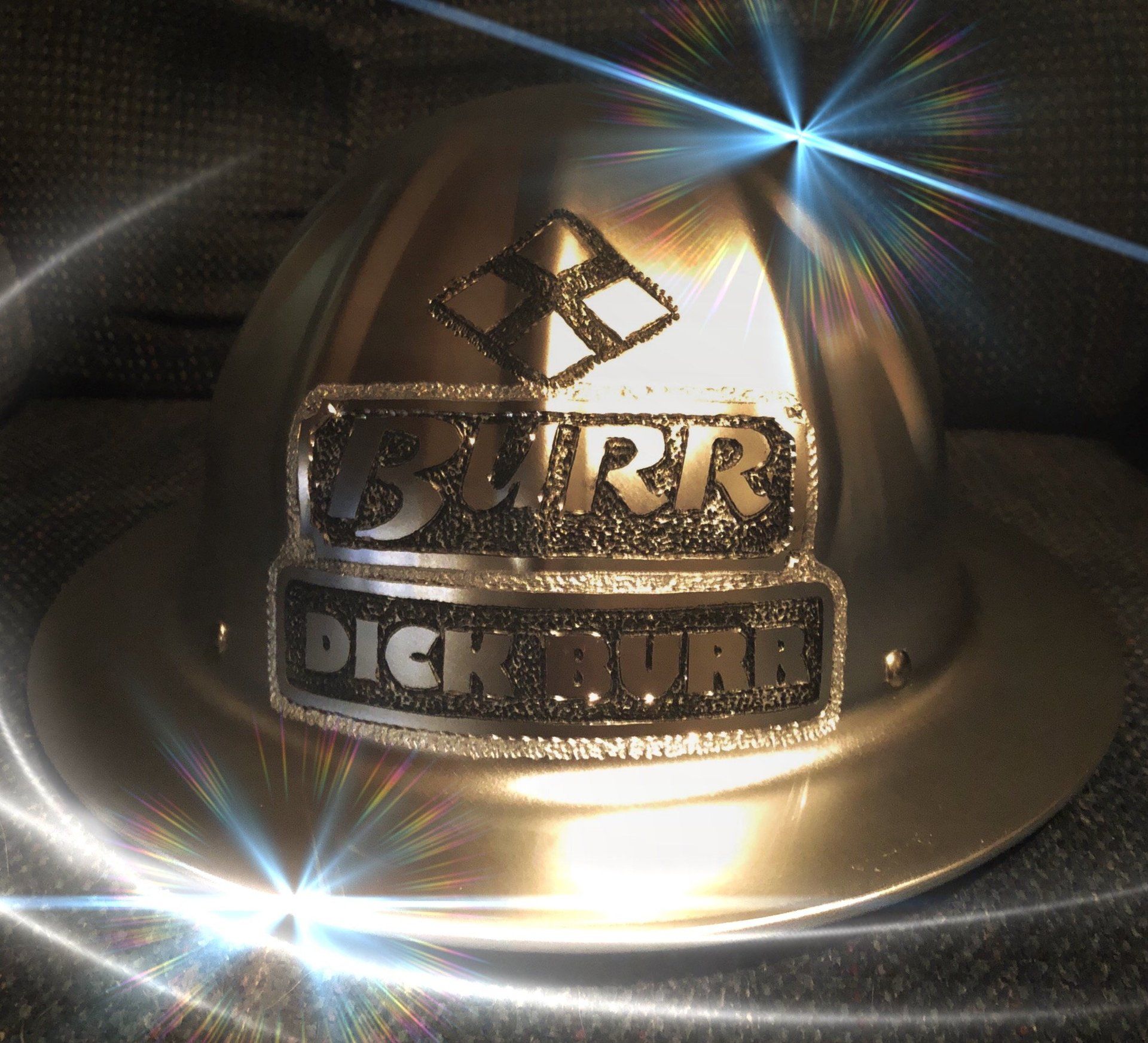 This is a sample of a Logo and Name on a cap style silver hardhat. Refer to "Hardhat pricing options" above for details